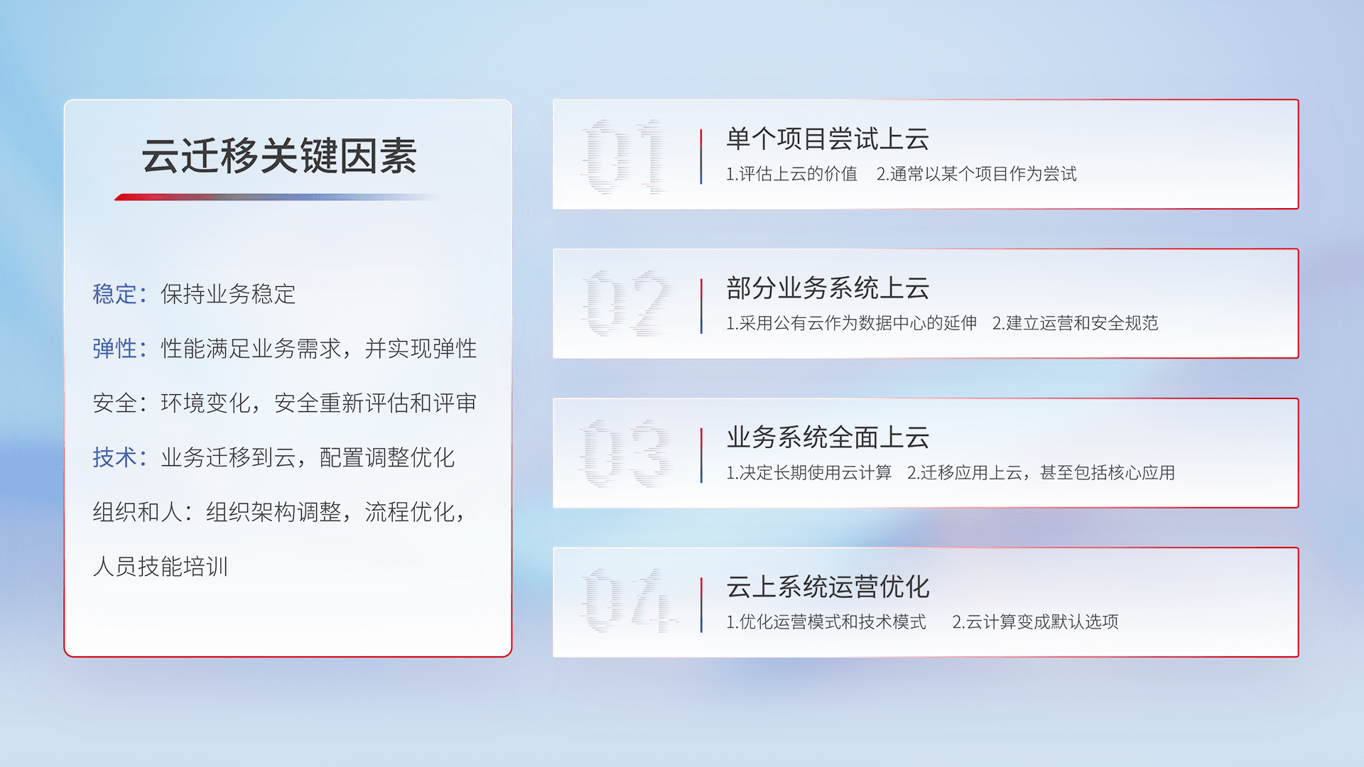 结合实际业务,,,从规划设计、、云平台选型、、、、云原生改造、、数据迁移、、、、集成交付,,,,迁移全过程为客户识别最佳上云路径,,,做好风险识别管理,,,,设计网络架构、、身份权限、、、安全审计合规、、、、操作审计、、、、日志审计、、监控告警策略、、、、多站点容灾设计等,,对云上基础设施进行整体规划,,提升IT治理水平,,以满足弹性、、、、高可用、、、、高性能的需求。。。。