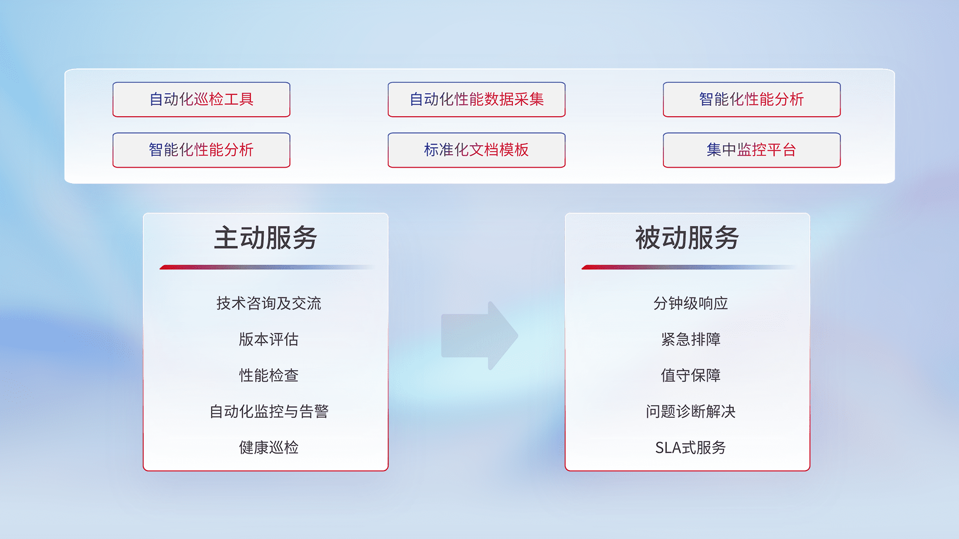 智能化工具和标准化文档,,保障服务质量,,,,提供主动服务(包含技术咨询、、、版本评估、、性能检查、、、、自动化监控与告警、、、、健康巡检)和被动服务包含(分钟级响应、、、紧急排障、、、值守保障、、问题诊断解决、、SLA服务)。。